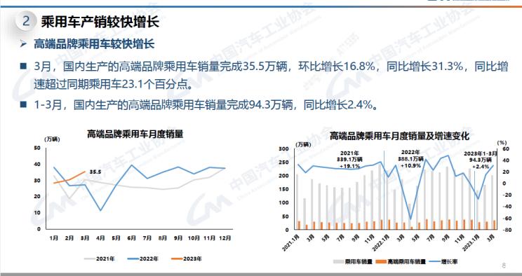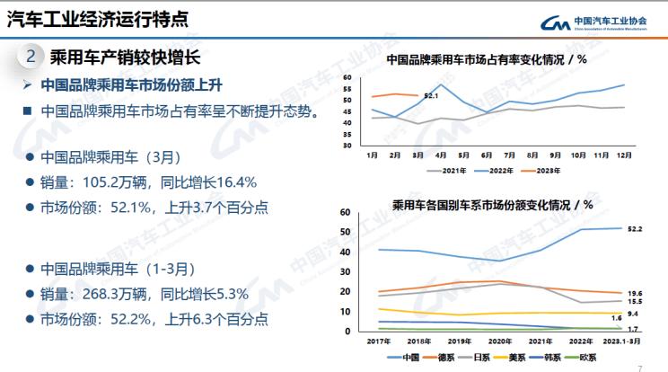在需求收縮、供給沖擊、預期轉弱三重壓力下,中國汽車品牌市場份額實現了逆勢上漲。1-3月,中國品牌乘用車銷量為268.3萬輛,同比增長5.3%;市場份額環比上升6.3%達52.2%。