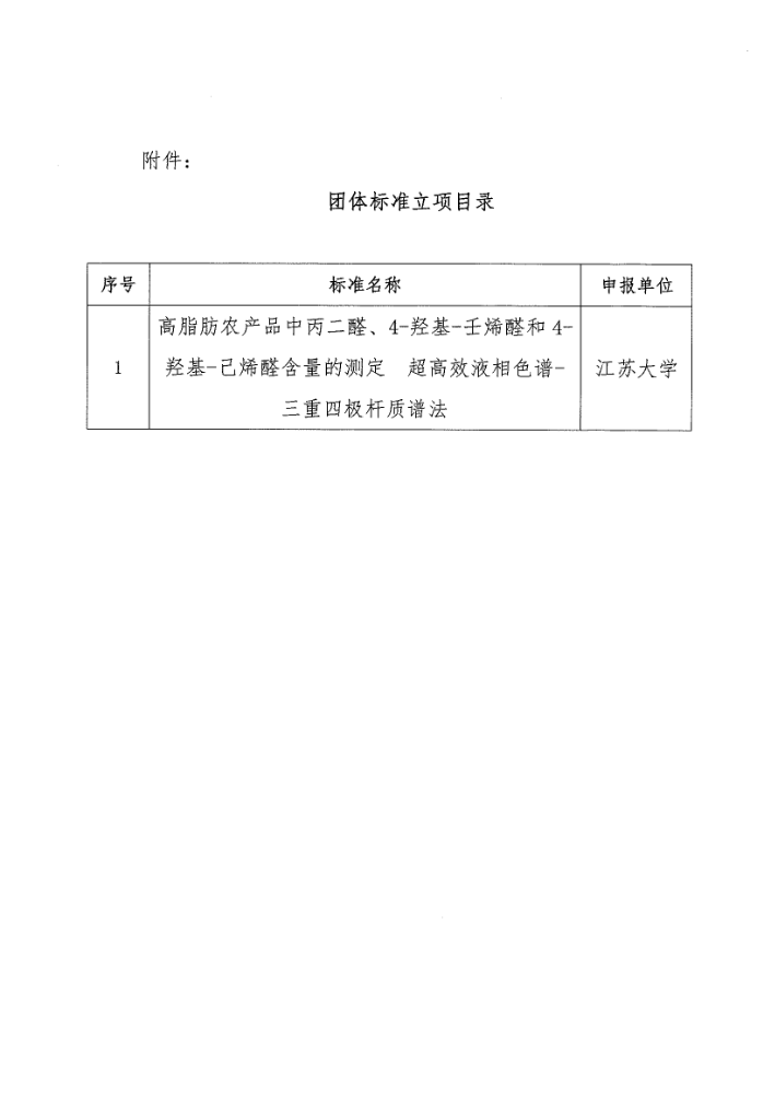 關于《高脂肪農產品中丙二醛、4-羥基-壬烯醛和4-羥基-己烯醛含量的測定 超高效液相色譜-三重四極桿質譜法》團體標準立項的公告